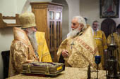 По завершении Крестного хода настоятель храма протоиерей Владислав тепло поблагодарил владыку за посещение храма и совершение Божественной литургии и в память совместных молитв преподнес икону Трех Святителей.