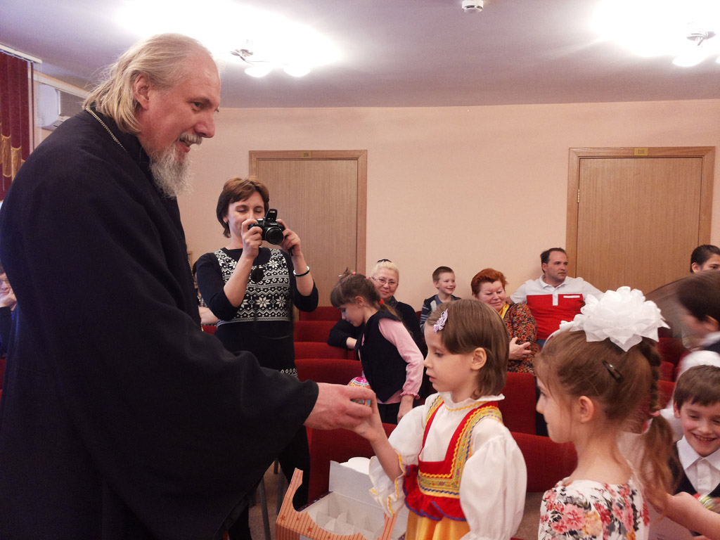 Настоятель поздравил присутствующих с праздником Святого Христова Воскресения, рассказал о Пасхе Христовой, добре и зле и победе жизни над смертью через Крестную смерть и Воскресение Господа нашего Иисуса Христа. Также он всех поздравил с приближающимся праздником 70-летия Победы в Великой Отечественной Войне.