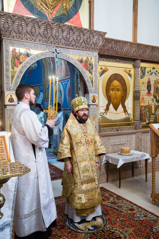 По заамвонной молитве Высокопреосвященнейший владыка совершил молитву на раздробление артоса.