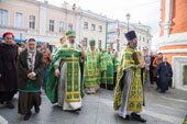По окончании Божественной литургии Преосвященный владыка совершил молебное пение святому праведному Алексию Московскому с Крестным ходом вокруг храма.