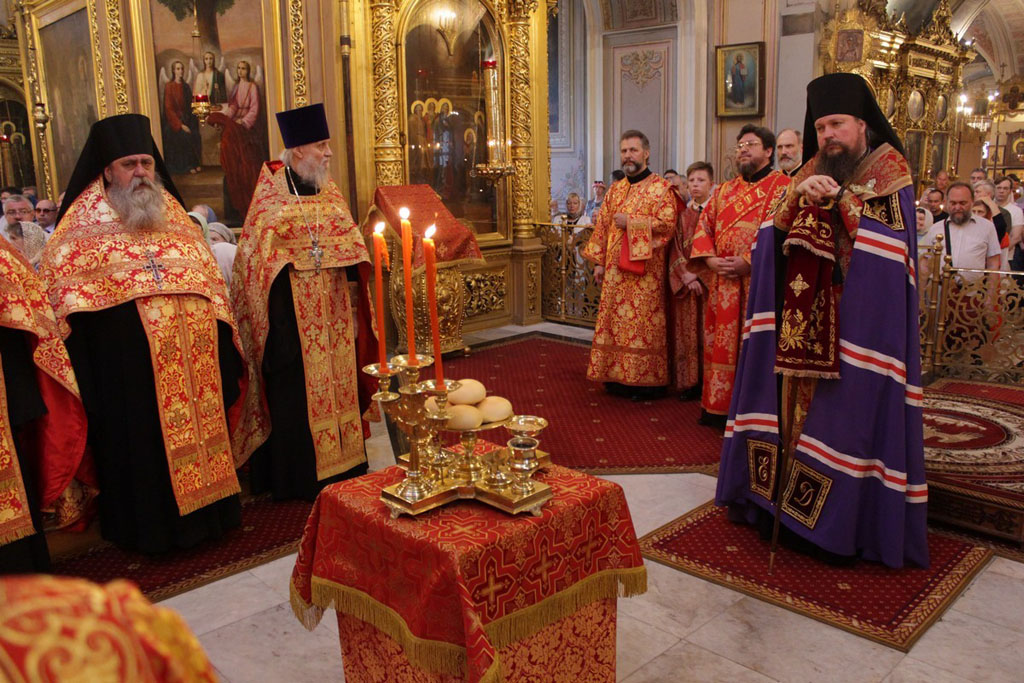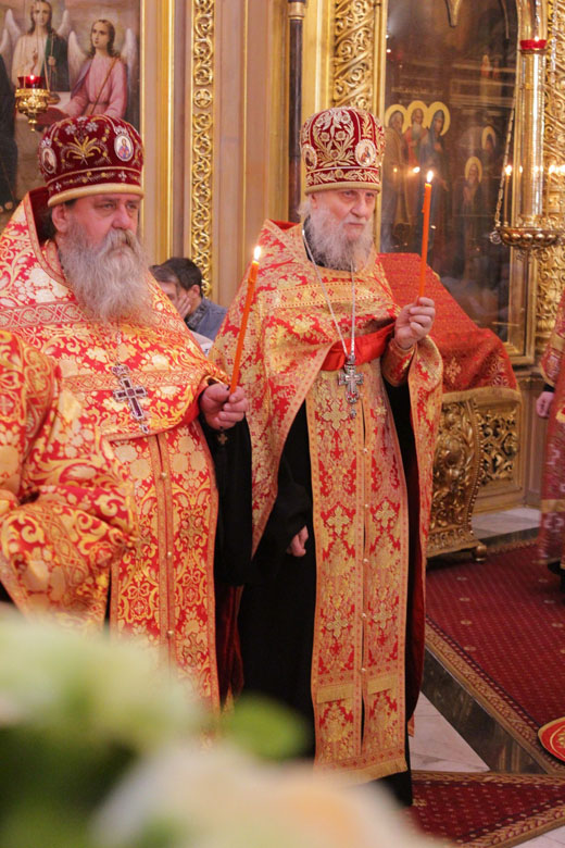 Преосвященным Владыкам сослужили: протопресвитер Владимир Диваков, секретарь Святейшего Патриарха по г. Москве; протоиерей Александр Агейкин, настоятель собора; архимандриты: Алексий (Вылажанин), благочинный храмов Петропавловского церковного округа, Арсений (Топузов), клирик Иваново-Франковской епархии (утро); протоиереи: Александр Аржаев, клирик собора (вечер), Дамиан Круглик, настоятель храма Преображения Господня в Богородском (вечер), Сергий Точеный, настоятель храма св. ап. Иакова Зеведеева в Казенной слободе, Борис Обрембальский и Михаил Райчинец, клирики собора, Алексий Круглик, и.о. настоятеля храма Вознесения Господня (Малое Вознесение) на Большой Никитской (вечер); иереи: Алексий Артамонов и Алексий Козливсков (вечер), клирики собора, Константин Голов, клирик храма свв. бессребренников Космы и Дамиана в Космодемьяновском; протодиаконы: Николай Платонов, Михаил Гречишкин (вечер) и диакон Алексий Катанников, клирики собора, Василий Ковальчук, клирик Донского мужского монастыря г. Москвы.