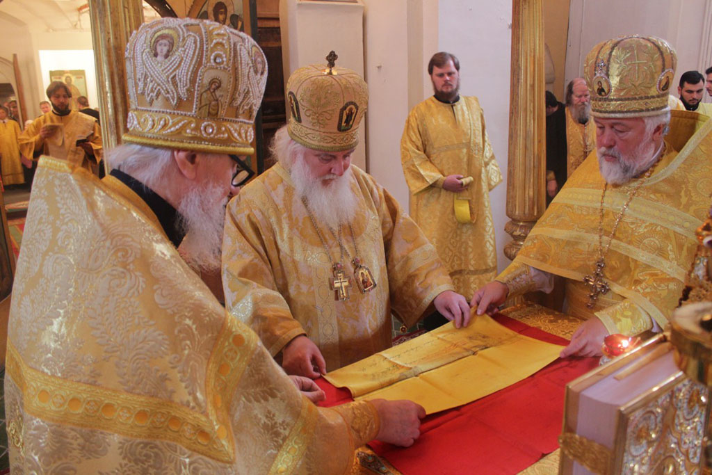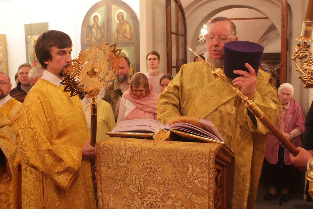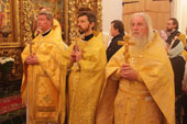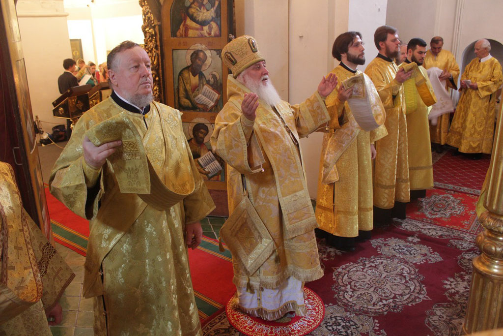 Его Высокопреосвященству сослужили: протопресвитер Владимир Диваков, секретарь Святейшего Патриарха по г. Москве; протоиереи: Георгий Студенов, благочинный храмов Михайловского церковного округа, Александр Фарковец, благочинный храмов Донского церковного округа, Владимир Чувикин, ректор Перервинской Духовной Семинарии, Сергий Точеный, благочинный храмов Богоявленского церковного округа, Олег Воробьев, благочинный храмов Даниловского церковного округа, Вячеслав Шестаков, настоятель Патриаршего подворья храмов в Зарядье, Алексий Моисеев, клирик храма Казанской иконы Божией Матери в Коломенском; протодиакон Валерий Щеглов, клирик храма Воскресения Христова в Сокольниках; диаконы: Виталий Гасанов, клирик храма свв. Девяти мучеников Кизических, Иоанн Грузинов, клирик храма Софии, Премудрости Божией, в Средних садовниках, Николай Кузнецов, клирик Иверского собора Николо-Перервинского монастыря, Максим Тогубицкий, клирик храма Усекновения главы Иоанна Предтечи в Братееве, Никита Кулешов, клирик храма Всех святых на Соколе.